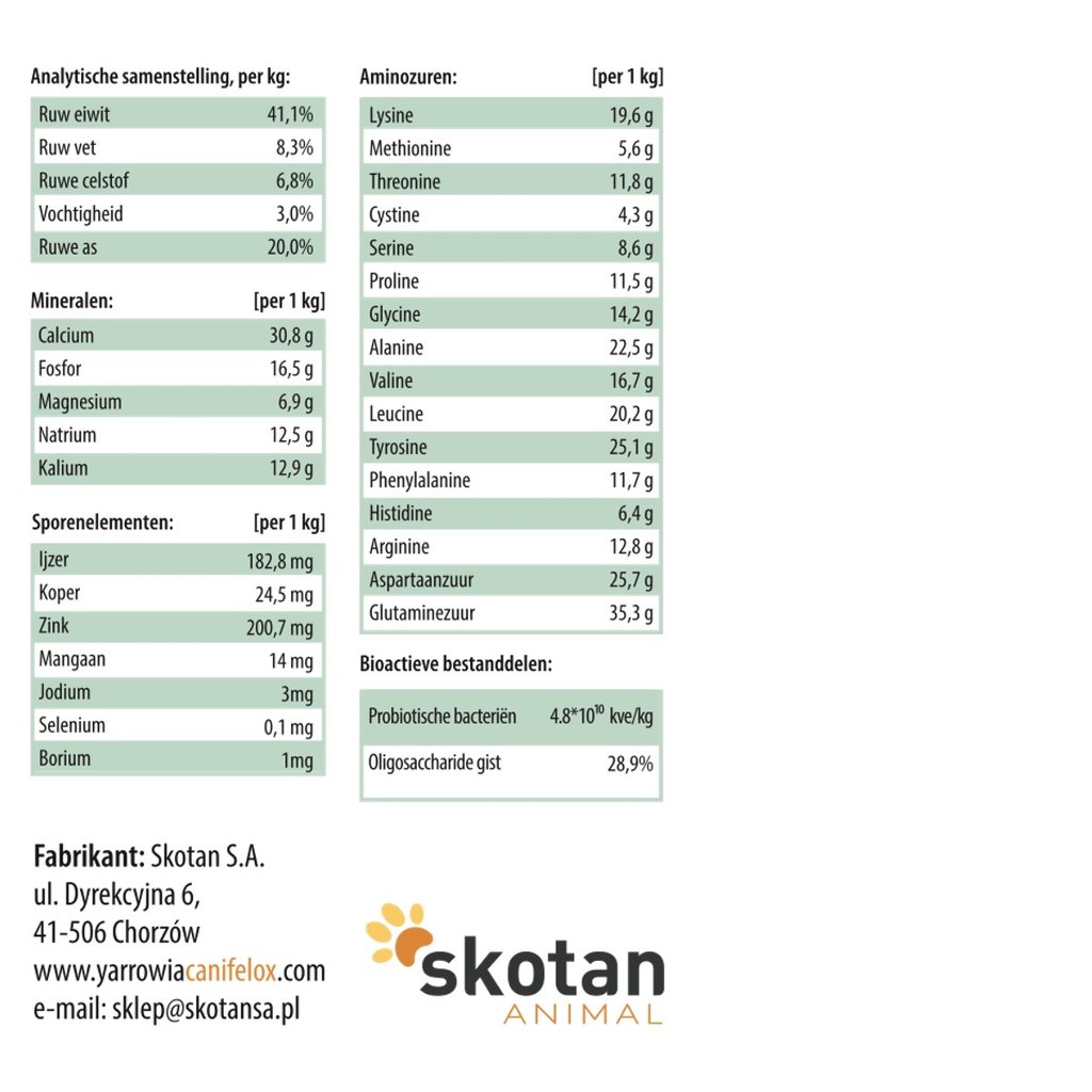 Yarrowia lipolytica gist, zeealgen, mariadistel. Toevoegingsmiddelen: Probiotische bacteriën (Lactobacillus acidophilus: 4b1715, Enterococcus faecium: 4b1708, Pediococcus acidolactici: 4d1712, Lactobacillus casei: 4b1892). |