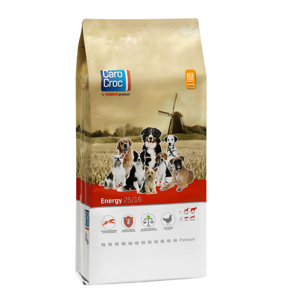 Door de vele energie die er verbruikt wordt bij grote inspanning is er sprake van een hoge energiebehoefte. Alle energie die verbruikt wordt moet ook aangevuld worden. De energie in de CaroCroc Energy brokken vormt zich door een uniek eiwit- en vet gehalte. De vetten en eiwitten in de brokken zijn zo afgestemd dat jouw energieke hond alle energie krijgt die hij nodig heeft. De getallen 25 en 16 staan voor respectievelijk het percentage eiwit en vet; ideaal voor de honden die meer dan gemiddeld veel energie nodig hebben en op normale voeding snel gewicht verliezen.