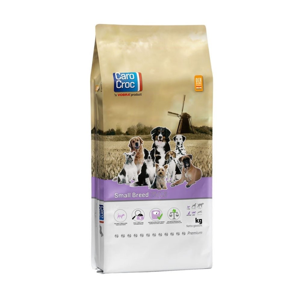 De getallen 25 en 16 staan voor respectievelijk het percentage eiwit en vet; ideaal voor de volwassen hond van kleine rassen met specifieke aandacht voor hun aanleg voor overgewicht. Honden van kleine rassen hebben een kleinere bek dan honden van grote rassen, het aantal tanden verschilt echter niet. Het betekent wel dat de tanden dichter op elkaar staan, wat er voor zorgt dat het risico op tandplak en tandsteenvorming groter is. Wanneer hier met het voer geen rekening mee gehouden wordt kan jouw hond te kampen krijgen met een slechte adem. Hiernaast hebben kleine rassen ook meer aanleg voor het ontwikkelen van overgewicht. CaroCroc Small Breed is speciaal afgestemd om deze specifieke behoeften te ondersteunen.