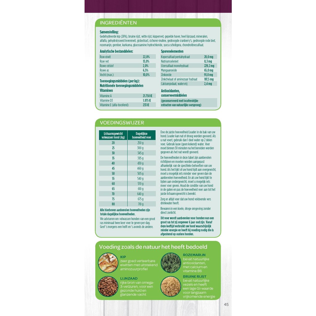 Voor honden die het verdienen zich optimaal te voelen en er optimaal uit te zien. De grotere hoeveelheden eiwitten, oliën en omega-3-vetzuren in Leader Adult Large Breed Supreme bieden volwassen honden superieure voeding ter ondersteuning van een uitstekende gezondheid en vitaliteit en een optimaal uiterlijk. Het voer met kip en rijst is zeer goed verteerbaar en smakelijk en verrijkt met grotere hoeveelheden glucosamine en chondroïtine voor gezonde gewrichten. De vorm en het formaat van de grote brokken zijn perfect voor honden van een groot ras.