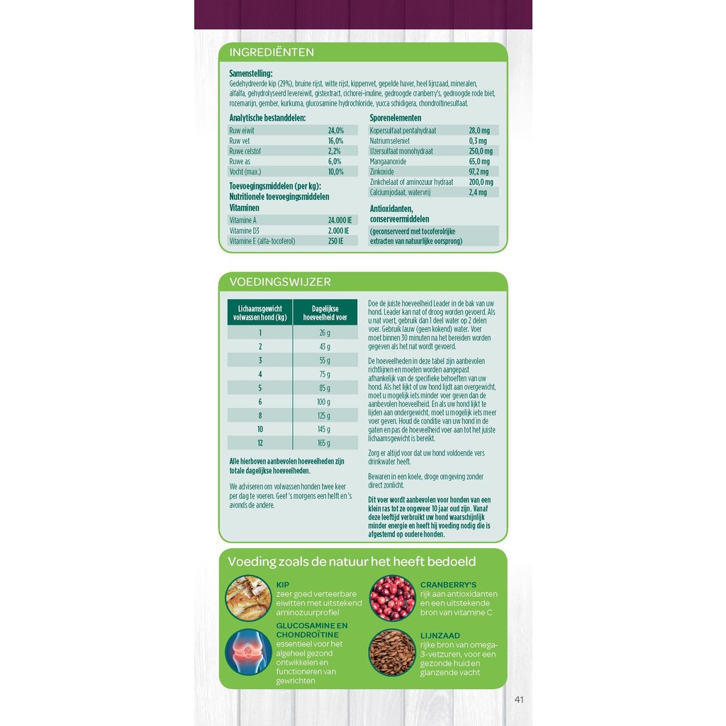 Gedehydreerde kip (29%), bruine rijst, witte rijst, kippenvet, gepelde haver, heel lijnzaad, mineralen, alfalfa, gehydrolyseerd levereiwit, gistextract, cichorei-inuline, gedroogde cranberry’s, gedroogde rode biet, rozemarijn, gember, kurkuma, |