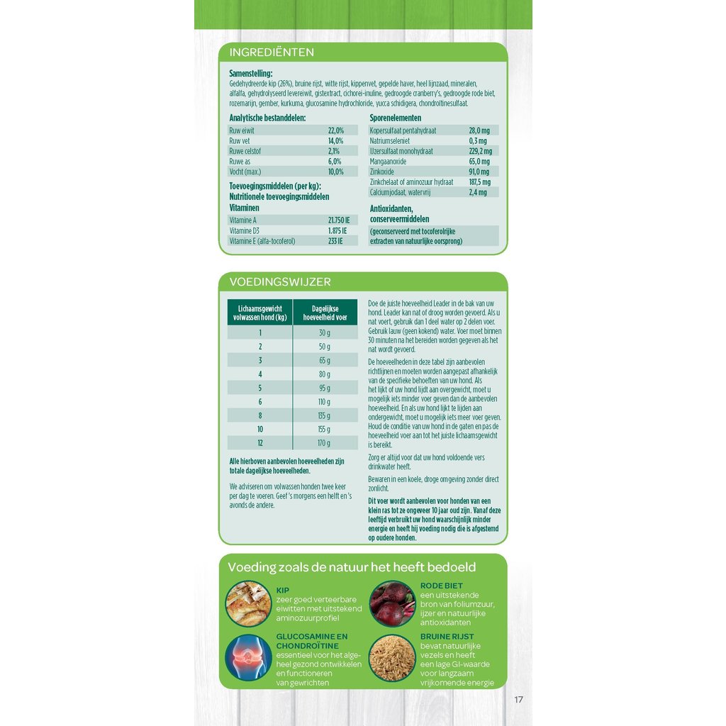 Op aanraden van het nestje waar wij onze hond hebben gekocht krijgt onze cocker spaniel nu al 7 maanden Leader brokken. Hij groeit goed, heeft een glanzende vacht en vindt ze lekker. Levering vanuit Mijnhondenvoer.nl is altijd snel en zonder problemen. Al een paar keer een leuk speeltje erbij gehad!